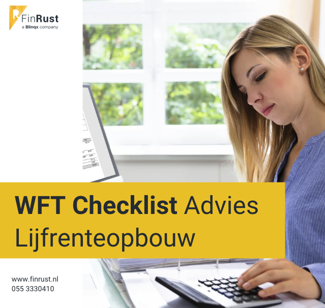 n deze toolkit vind je een checklist voor advies over lijfrenteopbouw. Met deze checklist weet je zeker dat je niets mist voor de Wft. Leg ’m naast je eigen teksten en dossiers om snel te controleren! Ook essentieel voor de Wft is de passendheid van het advies zoals het bepalen van de hoogte van het doelkapitaal. Daarbij kan FinRust je helpen.